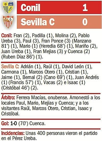 Con muy pocas ocasiones de gol pero sin generar errores defensivos, el Conil hace que con una ocasión que consiga le baste para obtener un buen resultado. Al final, 1-0 y tres puntos importantes para el casillero jandeño. Salvo Vacas, que buscaba alguna jugada combinativa, poco hay que destacar en el conjunto de Lolo Rosano. Isaac también estuvo activo en el ataque. Un despiste defensivo de Carmona terminó significando el único gol del encuentro para los de Lázaro Canto. Tras el gol, el Sevilla quedó desconcertado y grogui, y no consiguió recomponerse para lograr el empate. La derrota aleja a la escuadra nervionense de los puestos de 'play off' y le permite al Conil acercarse a su objetivo.