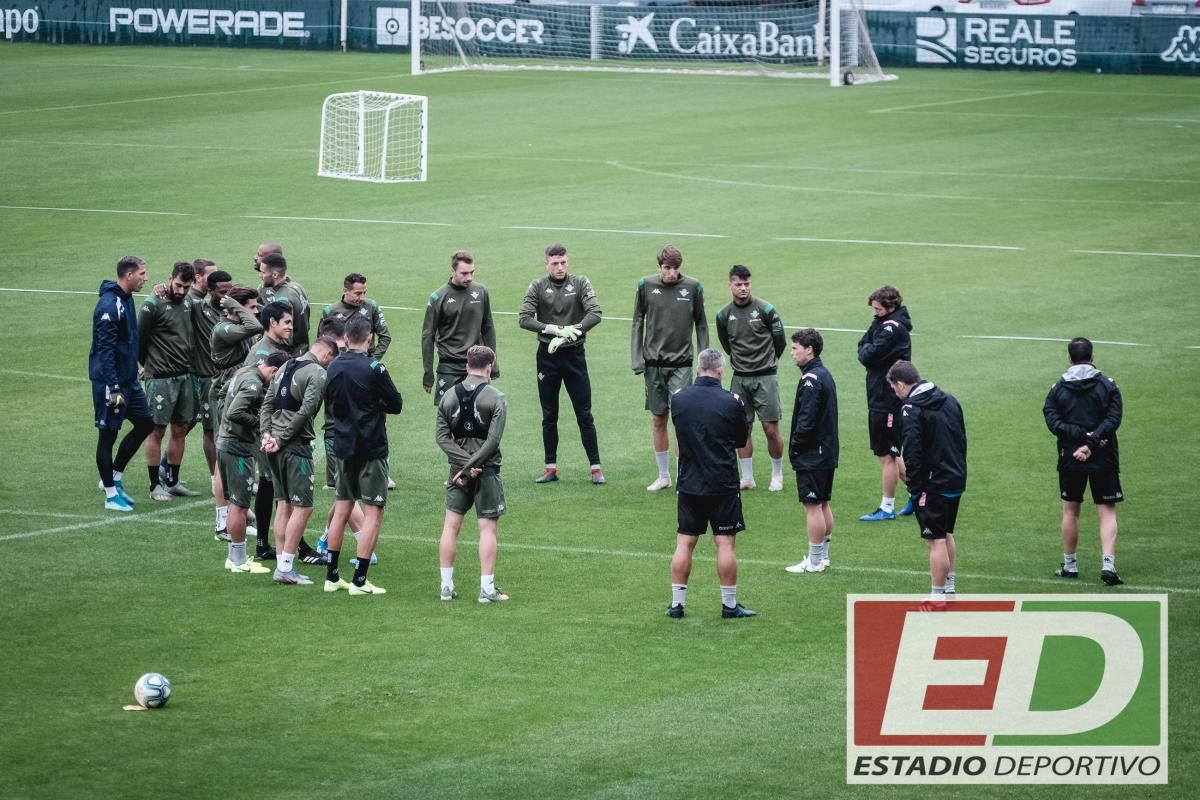 En lo que al entrenamiento propiamente respecta, una sesión pasada por agua en la que el canterano Francis trabajó junto al grupo. Un entrenamiento del primer plantel del Real Betis Balompié que, en todo momento, ha sido seguido atentamente en directo por el presidente Ángel Haro, Alexis y Catalán.