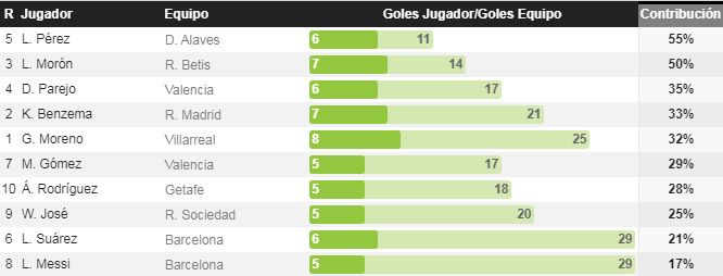 No en vano, el '16' verdiblanco tiene la segunda mayor contribución goleadora de LaLiga (50)%), tras el alavecista Lucas Pérez (55%), tras haber firmado siete de los 14 tantos del cuadro de Rubi en el campeonato doméstico.