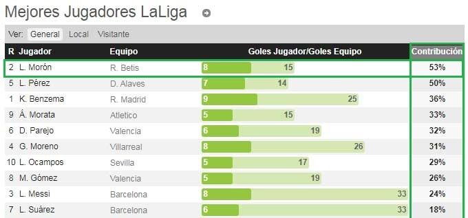 Y no es nada baladí, pues la de Loren es superior, por ejemplo, a la de futbolistas top como Messi (24%), Benzema (36%) o Immobile (50%) y similar, por ejemplo, a la de Lewandowski (55%). Sumando su asistencia, además, la participación total de Loren en los goles del Betis sube hasta el 60%.