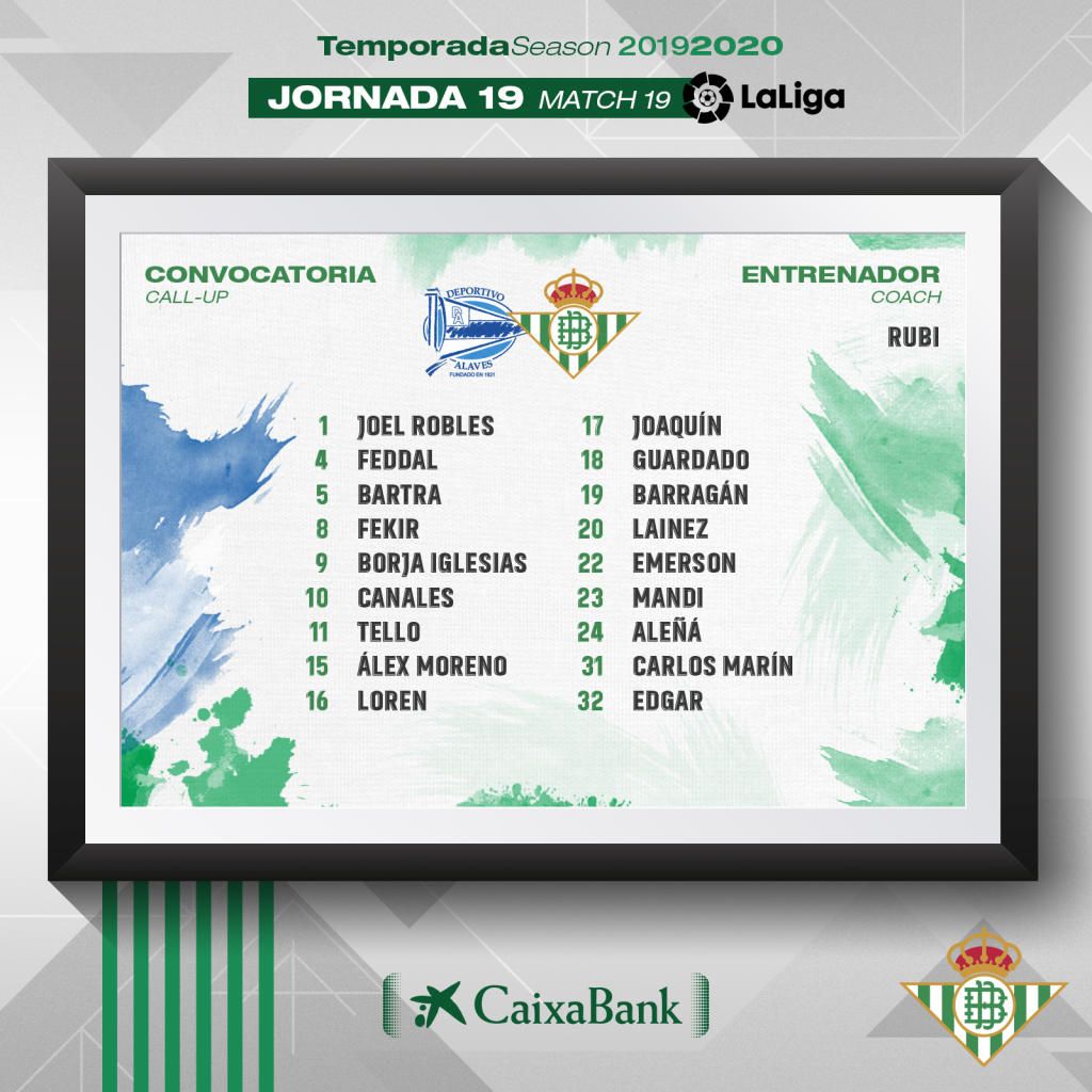 La presencia de Carles Aleñá representa la principal novedad de la lista de convocados ofrecida por el entrenador del Real Betis, Joan Francesc Ferrer 'Rubi', para la visita del equipo verdiblanco al Deportivo Alavés este domingo (16:00 h).