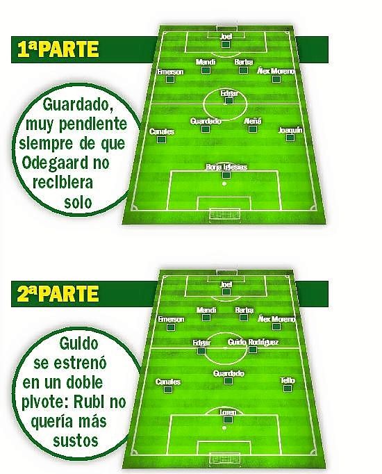 No habían encajado de córner hasta ahora los easonenses, si bien la voracidad de un Borja Iglesias necesitado de alegrías sirvió para abrir el marcador. Pero la brillante primera mitad del Betis pedía a gritos más distancia en el electrónico. Las buenas vigilancias por dentro, en especial de un inspiradísimo Guardado, 'secaron' a Odegaard y Mikel Merino, al tiempo que las transiciones, con buenas aperturas a las bandas, hacían daño por parte heliopolitana. Joaquín avisó antes de que el buen achique del ‘Panda’ y de Emerson a Guevara propiciara el error que desembocó en el 2-0.