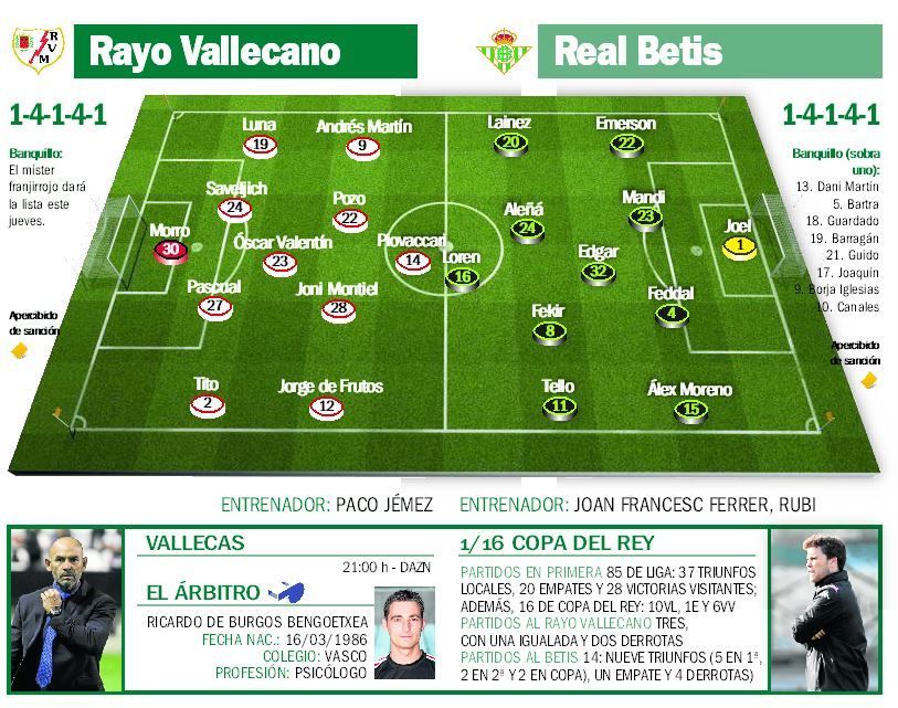 Por otra parte, los que vuelven de sanción, Feddal y Fekir, no deberían estar 14 o 15 días sin competir. Emerson cumple su castigo en el Coliseum, por lo que todo hace indicar que, pese a que Barragán pide paso, el brasileño saltará esta noche de inicio en Vallecas. Como Álex Moreno, sin recambio, y Joel, si bien Dani Martín espera un guiño desde el banquillo.