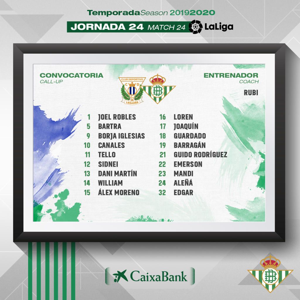Joel Robles, Dani Martín, Barragán, Emerson, Mandi, Bartra, Sidnei, Edgar, Álex Moreno, William Carvalho, Guido, Guardado, Aleñá, Canales, Tello, Joaquín, Borja Iglesias y Loren integran la lista de 18 futbolistas convocados del Real Betis para el encuentro de este domingo (14:00 h / Gol) en Butarque, ante el CD Leganés.