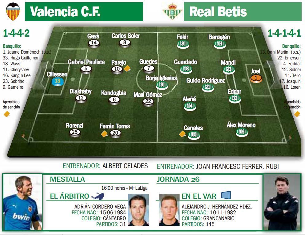 No parece el mejor momento para visitar Mestalla. Cercado por la amenaza del coronavirus, que se propaga por la Comunidad Valenciana, y con un anfitrión tan exigido por los últimos resultados como intratable en casa (invicto tras trece partidos ligueros), el conjunto de Celades es lo más parecido a un rival directo por Europa en el horizonte bético. Hay demasiada distancia a falta de trece jornadas como para soñar con un esprint final con premio, pero Rubi, que sabe de lo que habla por haberlo firmado ya con el Espanyol, no pierde la ilusión, por mucha sombra de destitución que sobrevuele ambos banquillos.