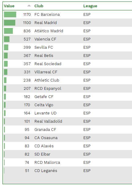 En cuanto a la clasificación que recoge a todos los equipos de las grandes ligas, el Betis ocuparía una meritoria 28ª posición, el Sevilla FC es 25º, en una tabla que encabeza el Liverpool (1.405). El equipo de Jürgen Klopp supera a Manchester City, los dos gigantes españoles (Barcelona y Real Madrid) y Chelsea. La valoración de este último equipo ha aumentado considerablemente gracias al estallido de muchos jóvenes talentos tras la prohibición de poder fichar por la FIFA al club de Londres.