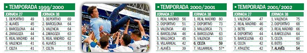 Cuatro unidades por debajo del listón europeo estaban el propio 'EuroBetis' de Setién, que en la jornada 27 estaba décimo y logró concluir ese curso en sexto lugar. También cuatro levantó el Celta en la 2000/2001, ascendiendo del noveno al sexto cajón. Otros logros dignos de ser mencionados son los tres puntos recortados por Valencia (08/09), Sevilla (03/04), Barça (02/03) y Alavés (01/02) o los dos puntos que remontaron los jugadores del Atlético de Madrid en la 2011/2012, o el punto de un curso antes.