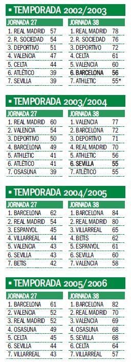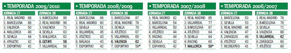 Otro -8 fue la distancia que limó el Mallorca en la 07/08 (de 11º a 7º), pero se quedó fuera de torneos los UEFA porque las dos últimas plazas fueron para los finalistas de Copa, Valencia y Depor, que quedaron más atrás. No menos meritorios fueron los cinco puntos que fue capaz de remontar el Espanyol de Rubi la pasada campaña (de undécimo a séptimo en las 11 últimas citas) o del Getafe en la 09/10 (octavo a sexto).