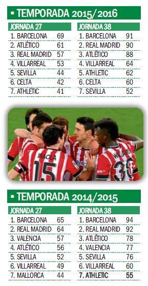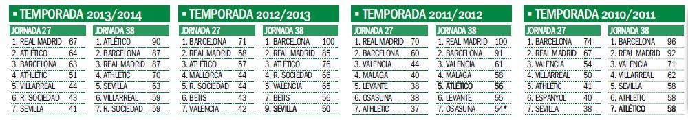 Eso sí, sólo el Villarreal logró remontar los nueve puntos de desventaja que tienen hoy los de Rubi. Fue en la 06/07, cuando era undécimo a falta de 11 jornadas y sumó 15 de los 33 puntos para acabar en el sexto puesto. Similar fue la escalada del Athletic en la 14/15, cuando levantó ocho puntos para pasar del octavo al séptimo escalón e ir a Europa League.