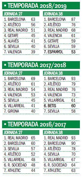 Tanto es así, que de las 20 últimas Ligas (desde la 1999/2000 a la 2018/2019) sólo en seis de ellas los siete primeros clasificados en la jornada 27 repetían en ese 'Top-7' en la jornada 38 y en esos seis ejemplos nunca se ha mantenido el orden. Es decir, que en 14 de los 20 últimos campeonatos, algún equipo que estaba fuera de los puestos continentales en la jornada 27 consiguieron el objetivo que se proponen a día de hoy los béticos.
