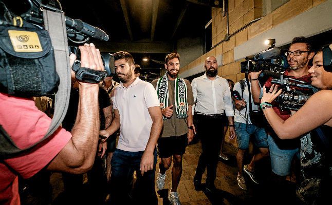 Borja Iglesias, rodeado de cámaras, a su llegada a Sevilla para firmar por el Betis.R. S.