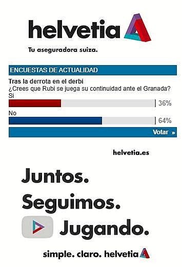 En ESTADIO Deportivo hemos querido pulsar la opinión de los aficionados con la 'Encuesta Helvetia', con una pregunta muy directa: ¿Crees que Rubi se juega su continuidad ante el Granada? Y pese al enfado que existe en el beticismo por la derrota y la imagen de su equipo ante el Sevilla FC, un 64% de los participantes en la encuesta se decanta por pensar que Rubi no se la juega, por lo que seguiría en su cargo pase lo que pase ante el Granada.