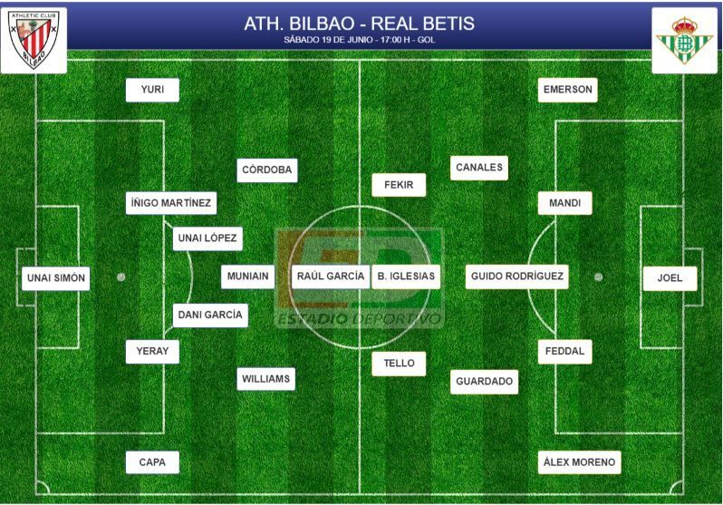 El cuarto atacante rojiblanco debe salir a priori entre De Marcos, Córdoba e Ibai Gómez; mientras que al doble pivote opta, para acompañar a Dani García, una terna formada por Unai López (vuelve a la lista), San José y Vesga, ya que el exbético Beñat se ha quedado fuera de la lista de 23.