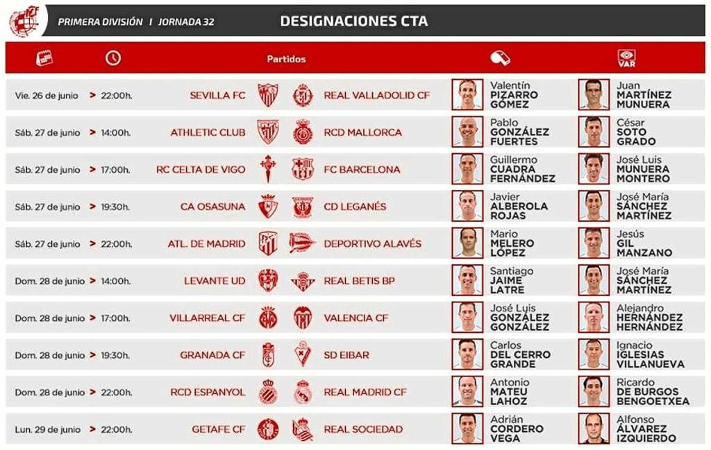 La Real Federación Española de Fútbol ha anunciado las designaciones arbitrales para la jornada 32 de LaLiga Santander, que comienza a disputarse a disputarse a partir del viernes y en la que el Betis visita al Levante y el Sevilla recibe al Valladolid en el Sánchez-Pizjuán.