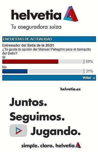 Eso, al menos, es lo que se desprende de la Encuesta Helvetia llevada a cabo por ESTADIO entre sus lectores: ¿Te gusta la opción del Manuel Pellegrini para el banquillo del Betis? Ante esta pregunta, el 69% de los participantes se ha mostrado partidario de la llegada al Betis del ex técnico del Villarreal, entre otros, mientras que un 31% ha dejado patente que el chileno no es un entrenador de su gusto. La decisión está en manos de Haro y compañía.