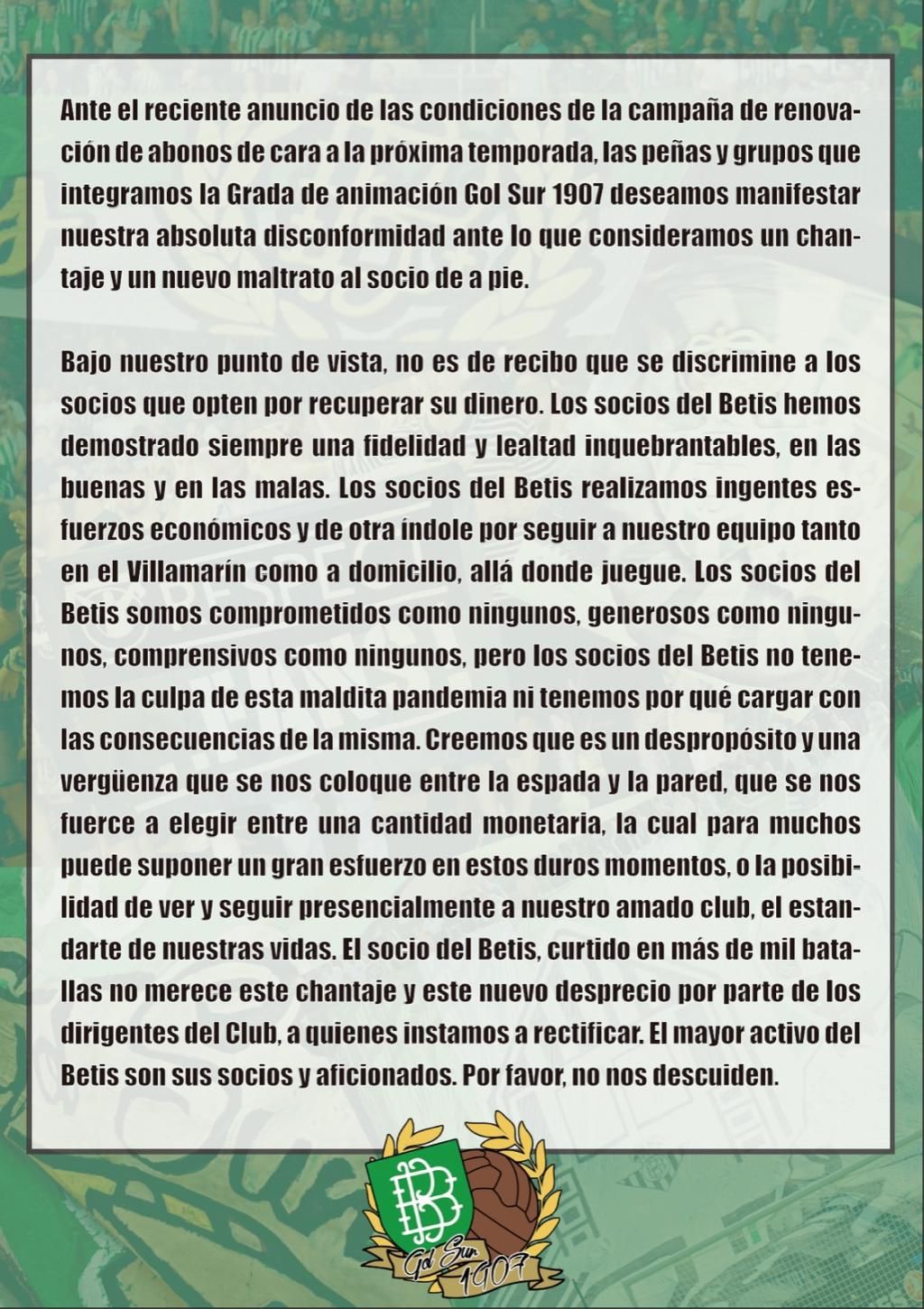 "No es de recibo que se discrimine a los socios que opten por recuperar su dinero. Los socios del Betis hemos demostrado siempre una fidelidad y lealtad inquebrantables, en las buenas y en las malas. (...) Creemos que es un despropósito y una vergüenza que se nos coloque entre la espada y la pared, que se nos fuerce a elegir entre una cantidad monetaria, la cual para muchos puede suponer un gran esfuerzo en estos duros momentos, o la posibilidad de ver y seguir presencialmente a nuestro amado club", señala el comunicado de Gol Sur 1907.