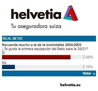 El parecido radica principalmente en la anchura de las rayas verdes, lo que ha gustado a un betiscismo que está muy satisfecho con el nuevo diseño. Es lo que se desprende, al menos, del resultado de la encuesta realizada por ED acerca de si le parece atractiva la nueva camiseta. Así, un 84% de los participantes aseguran que le gusta la apuesta de esta temporada para la primera equipación, mientras que sólo el 16% habría preferido un modelo distinto.
