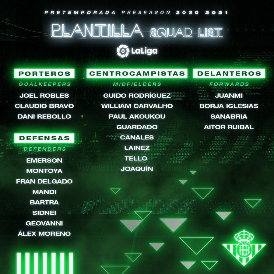 La lista de 23 jugadores está compuesta por los tres porteros que, salvo que se produzca un nuevo fichaje, iniciarían la Liga, ocho defensas, ocho centrocampistas y cuatro delanteros. Una lista equilibrada en la que aún está Aitor Ruibal, un jugador que también tiene muchos pretendientes. Así como Paul, uno de los canteranos que más gustan a Pellegrini.