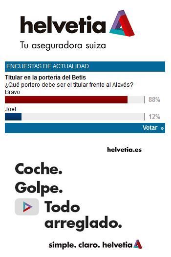 Así, en la ‘Encuesta Helvetia’ lanzada por ESTADIO Deportivo, Bravo se impone con autoridad como el predilecto del beticismo de cara al encuentro ante el Alavés, con un 88% de los votos, muy por encima del 12% de Joel Robles, que la pasada campaña fue indiscutible, tras la marcha de Pau López y la escasa competencia del ahora lesionado Dani Martín, y completó un curso con luces y sombras.