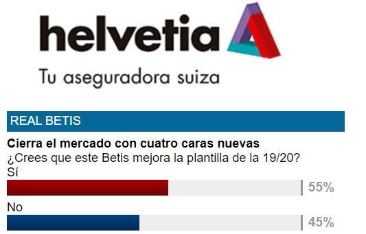 Con todo, en la #EncuestaHelvetiaED propuesta por el portal web de ESTADIO Deportivo, un 55 por ciento de los participantes considera palpable la mejoría; frente a un elevado 45 por ciento de opiniones críticas, que auguran unos problemas muy similares a los vividos en la 19/20 por mucho que la mano de Pellegrini sea un poderoso reclamo para que el Betis cuente con el apoyo y el aliento de su gente.