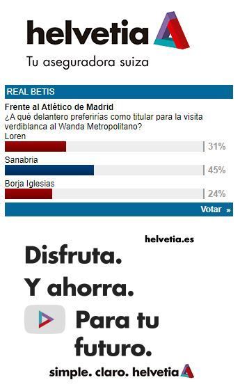 ESTADIO Deportivo quiso conocer la opinión de la afición verdiblanca y cuál sería su primera elección para jugar como delantero ante el Atlético de Madrid este sábado a partir de las 21:00 horas. Y los resultados de la 'Encuesta Helvetia' no dejan lugar a dudas: Sanabria es el favorito.