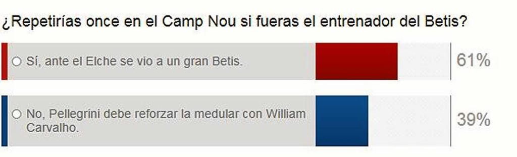 Unas dudas en el once durante la previa del partido en el Camp Nou que han empujado a ESTADIO Deportivo a sondear la opinión del beticismo al respecto. La afición del Betis, en cambio, parece tenerlo bastante claro, optando por darle continuidad al once empleado frente al Elche. Así lo demuestran los participantes de la #EncuestaHelvetiaED, donde un 61% de los encuestados se decanta por ello. El 39% restante, en cambio, se muestra mucho más conservador ante un equipo como el Barcelona en su casa. De ahí que para el Camp Nou entiendan que es necesario salir con un doble pivote puro.