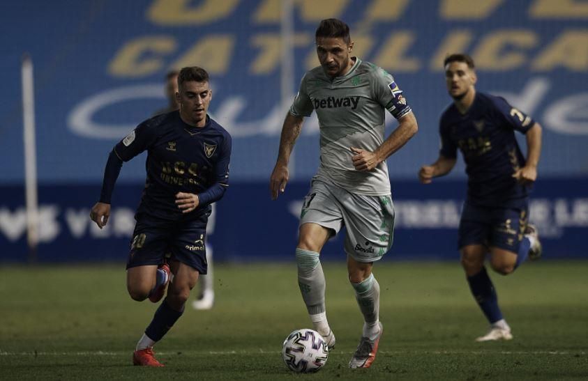 Acertó Pellegrini en el cambio de Guido, que dio más consistencia al centro del campo, aunque el UCAM se sacude el dominio bético en el arranque forzando un par de saques de esquina que lanza con peligro, pero que son bien defendidos por el conjunto bético.