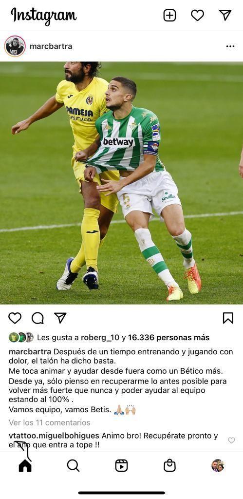 Así lo confirmaba en su cuenta de Instagram, en la que confirmaba lo adelantado por su técnico horas antes. "Después de un tiempo entrenando y jugando con dolor, el talón ha dicho basta. Me toca animar y ayudar desde fuera como un bético más. Desde ya, sólo pienso en recuperarme lo antes posible para volver más fuerte que nunca y poder ayudar al equipo estando al 100%. Vamos equipo, vamos Betis", escribía el central catalán.