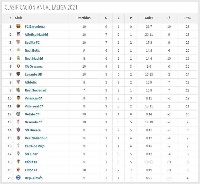 El balance de los heliopolitanos es brutal desde el inicio del nuevo año: 20 puntos de los 27 posibles. Es decir, un Betis de Champions que aparece en la cuarta posición de la tabla una hipotética clasificación anual. Tan sólo el Barça, con 28 puntos, el Atlético (23 puntos) y el Sevilla FC (22) superan a los heliopolitanos; todos ellos con un encuentro más desde el uno de enero. El Betis, con nueve partidos disputados, aparece cuarto con 20 puntos en su casillero; uno más que un Real Madrid que es quinto, a expensas de lo que ocurra esta noche en el estadio Alfredo Di Stéfano de Valdebebas entre el Real Madrid y la Real Sociedad.