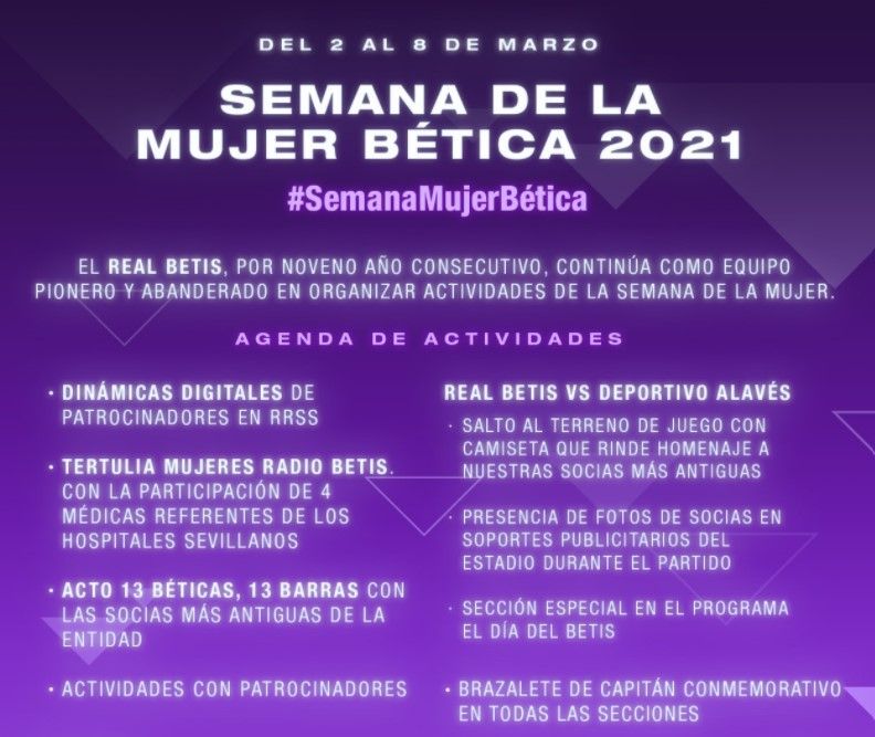 El ser un año especial, en el que no se puede hacer todo lo de otros años, no va a impedir que el Betis celebre su Semana de la Mujer Bética. El club verdiblanco ha perfilado una programación que desde este pasado lunes en el que involucrará a las mujeres y que concluirá el próximo lunes 8 de marzo, Día Internacional de la Mujer, con el partido que el club verdiblanco debe jugar contra el Alavés en el Benito Villamarín.