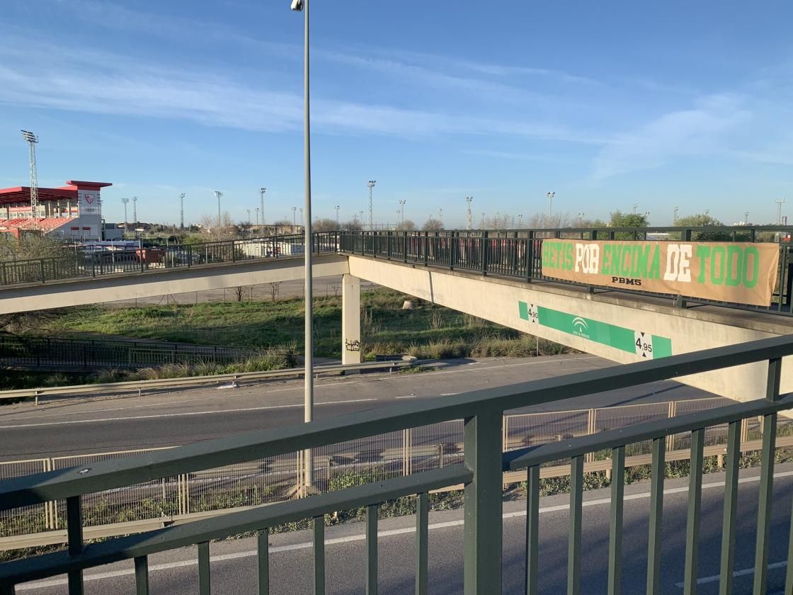 En este sentido, y lejos de los insultos con los que ha aparecido pintada la fachada del Sánchez-Pizjuán, un grupo de aficionados verdiblancos de la Peña Bética de Montequinto ha querido también expresar su apoyo al conjunto de Heliópolis de una manera muy singular, tiñendo de verdiblanco rincones muy reconocibles de su barrio.