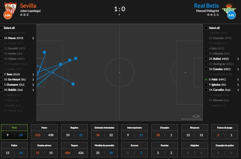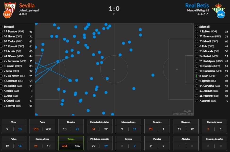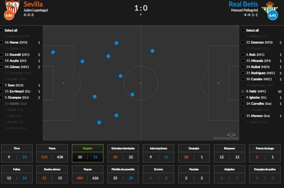 El mediapunta verdiblanco, a quien Pellegrini colocó esta vez en su sitio natural, la media punta, estuvo en todas partes, se ofreció siempre y fue, no en vano, de los que más pases dio (73) de todo el equipo heliopolitano.