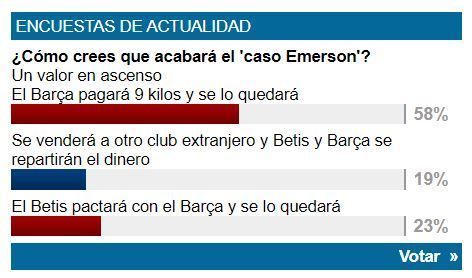 Otra posibilidad sobre la mesa es que la entidad verdiblanca sea la que ejecute la compra definitiva del jugador, opción que se abriría si el Barça renuncia a hacerlo, siendo los culés quienes se quedarían a su vez con el 20% del pase. Pero la delicada situación económica del Betis convierte esta posibilidad en poco probable, habiéndolo intentado ya a la baja. Ante esta situación, se presentaría un nuevo escenario: que ningún club compre su parte al otro. Si esto ocurre, Emerson tendría que poner rumbo al Barça, pero el Betis conservaría el 50% de una futura venta en cualquier momento, por lo que se trata de una posibilidad a tener muy en cuenta.
