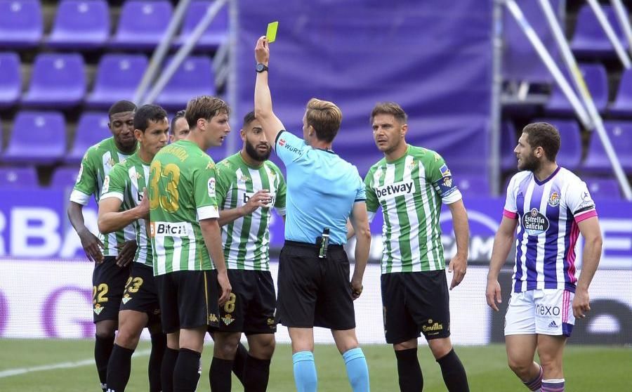 En lo que respecta a Fekir, la suerte no le ha acompañado, pese a su acto de contricción que le hizo aguantar cuatro meses al borde de la suspensión. La roja directa que vio ante el Athletic por su plantillazo a Unai Vencedor le hizo seguir apercibido, al tiempo que la acción tonta y evitable en Valladolid provocará que vuelva a perderse un encuentro crucial, aunque ya quedará limpio para los cuatro últimos. Guido Rodríguez, Miranda, Canales y William Carvalho (que no salió al terreno de juego) siguen con cuatro amarillas.