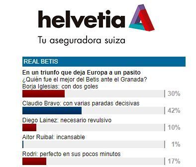 Ha sido la opción más votada al mejor del Betis-Granada con un 42 por ciento. Por detrás de Bravo, está el bigoleador verdiblanco, que se llevó un 30%. Completan la votación los importantes revulsivos, Rodri Sánchez (17%) y Diego Lainez (11%) y el incansable Aitor Ruibal (1%), que asistió a Borja en el tanto que abría el marcador en la primera mitad.