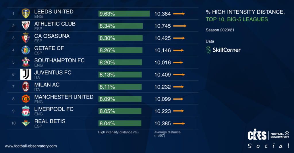 En la clasificación, reducida a las cinco ligas más potentes del continente, el Real Betis Balompié se cuela en décima plaza, siendo superado en España sólo por Athletic Club, CA Osasuna y Getafe CF. Destaca el liderazgo del Leeds United y la presencia de equipos punteros como AC Milan, Juventus o Liverpool.