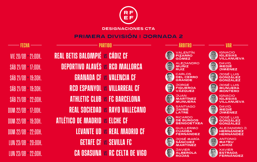 La RFEF publicó esta mañana los árbitros que pitarán los partidos correspondientes a la jornada dos del campeonato nacional de LaLiga.