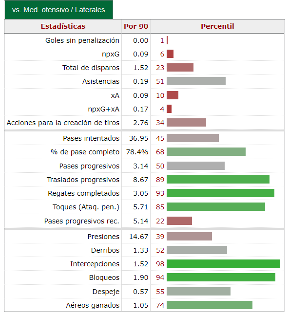 Ahora, y tras ver sus aportaciones con la selección absoluta de México y en la competencia olímpica, el Real Betis Balompié espera que su futbolista dé un paso adelante, sobre todo, en el aspecto ofensivo donde le falta capacidad de resolución tal y como indica esta estadística avanzada y que remarca el buen sacrifico defensivo y grupal del joven.