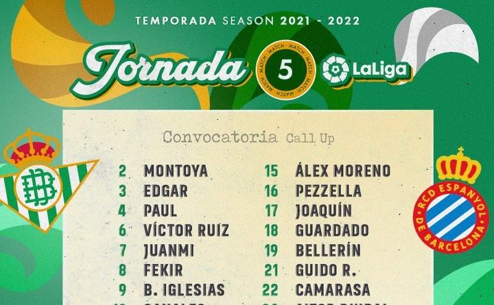 El Real Betis Balompié ha dado a conocer la convocatoria para el partido que jugará mañana contra el RCD Espanyol a partir de las 18:30 horas en el Benito Villamarín, correspondiente a la quinta jornada de LaLiga.