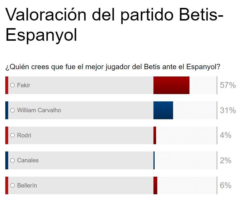 Solamente el soberbio partido que firmó Nabil Fekir acapara más votos que la actuación de William Carvalho. En total, un 57% de los participantes se rindió a la exhibición del francés, que anotó el tanto de la momentánea remontada, que mandó un intento al poste y que puso en apuros unas cuantas veces más a Diego López, capitaneando el juego de ataque del Betis. El ex del Lyon se echó el equipo a la espalda, viniendo a recibir, desbordando desde los costados y entendiéndose muy bien con sus compañeros del frente ofensivo. Una actuación sobresaliente que le reconocen propios y ajenos al '8' heliopolitano.