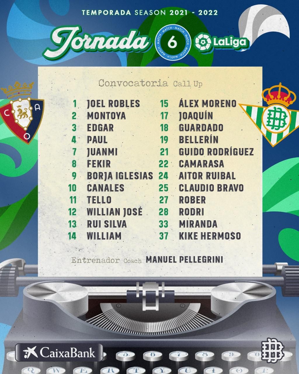 Al final, Pellegrini se lleva a 24 jugadores para vérselas con Osasuna. La lista está compuesta por Rui Silva, Claudio Bravo, Joel, Montoya, Bellerín, Edgar, Kike Hermoso, Miranda, Alex Moreno, Guardado, Guido Rodríguez, Camarasa, Aitor Ruibal, Paul, William Carvalho, Rodri, Rober, Joaquín, Juanmi, Fekir, Canales, Tello, Willian José y Borja Iglesias.
