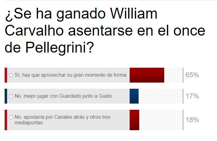 A Manuel Pellegrini y a sus compañeros no ha sido a los únicos que ha convencido Carvalho con su juego sino que tambíén los aficionados béticos le tienen estima, ya que en la #EncuestaHelvetiaED realizada por ESTADIO Deportivo en la que se cuestionaba sobre si Carvalho se ha ganado asentarse en el once titular, el portugués gozó de un respaldo mayoritario.