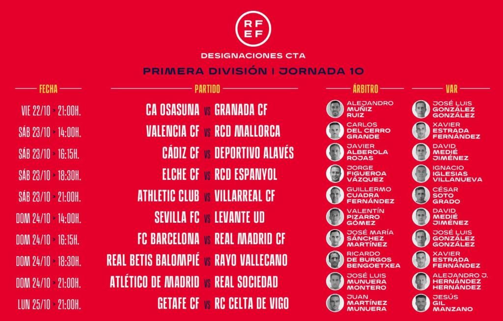 La Real Federación Española de Fútbol (RFEF) ha dado a conocer en la mañana de hoy los árbitros que serán los encargados de impartir justicia en la jornada 10 de LaLiga que se disputa este mismo fin de semana.