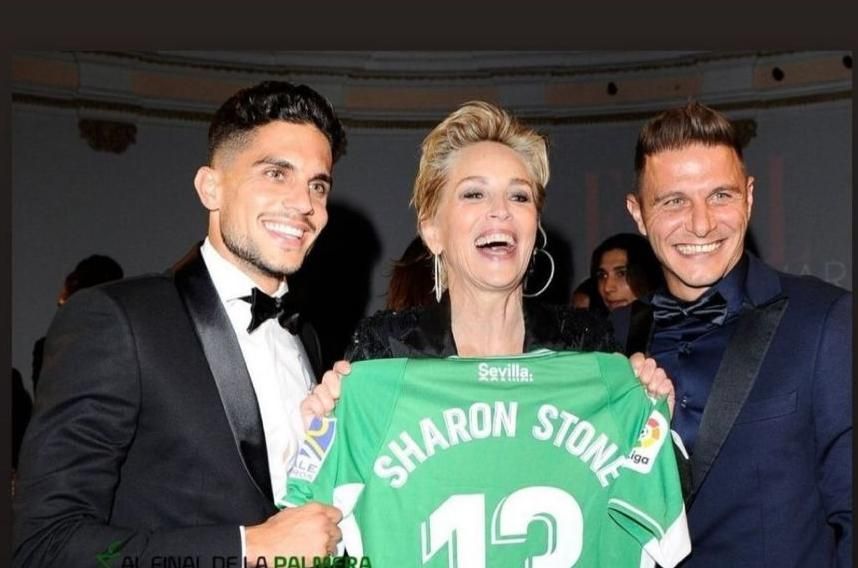 Ambos futbolistas entregaron a la protagonista de Instinto Básico una camiseta del Real Betis con el dorsal número 13 y con el nombre de la actriz. Stone no pudo ocultar su sorpresa y se mostró encantada de recibir ese obsequio. De hecho, posó ante todos los presentes mostrando el regalo junto a Joaquín y Bartra.