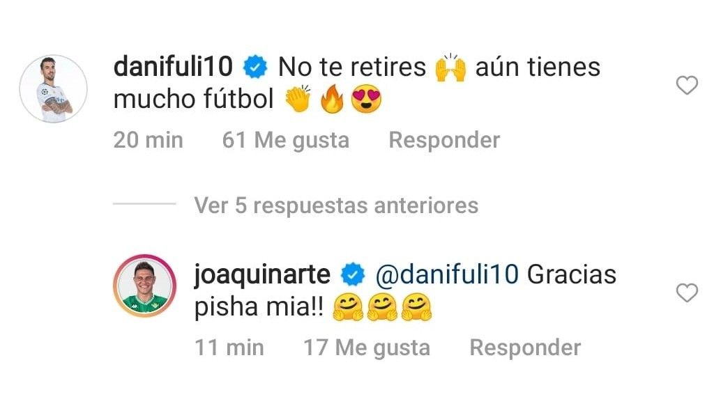 No sólo el coliseo de Heliópolis se inclinó ante la leyenda del '17' sino que otras personas tampoco se pudieron resistir a felicitar al capitán. Uno de ellos fue Dani Ceballos, canterano de Real Betis y actual jugador del Real Madrid, que en redes sociales le pidió a Joaquín lo siguiente: "No te retires. Aún tienes mucho fútbol".