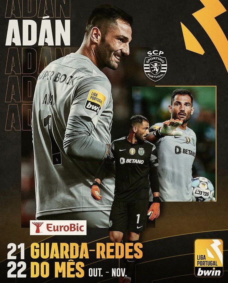 El español del Sporting de Portugal Antonio Adán ha sido nombrado mejor portero de la Liga lusa en los meses de octubre y noviembre, una distinción que también le fue otorgada en agosto y que da continuidad a su espectacular rendimiento en los 'Leones', ya que en junio fue elegido también mejor guardameta del campeonato luso de la temporada, después de haber sido elegido MVP en varios meses durante la 20/21.
