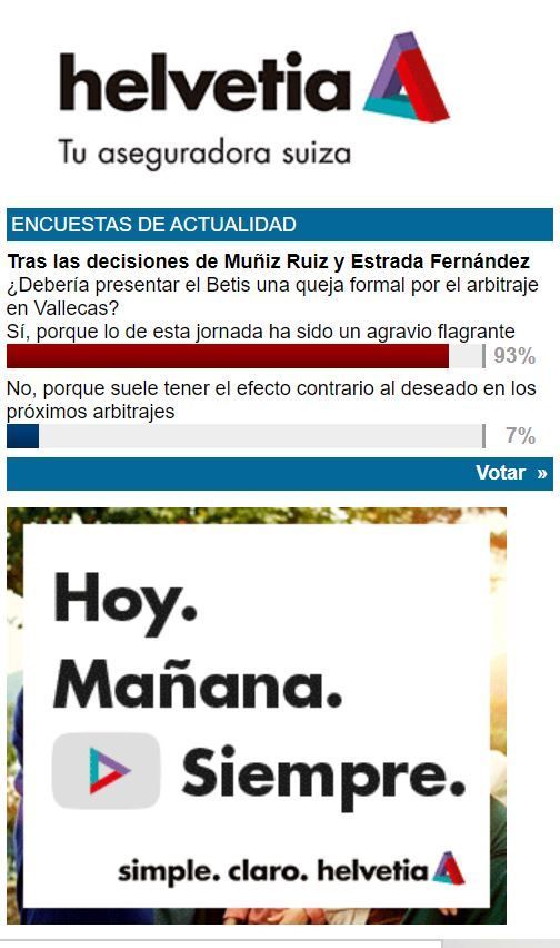 En nuestra 'Encuesta Helvetia' preguntábamos ayer si el Betis debería presentar una queja formal por el arbitraje recibido en el Estadio de Vallecas. A lo que un 93% ha respondido con un sí rotundo, mientras que apenas un 7% no lo haría por temor a represalias en los siguientes partidos.