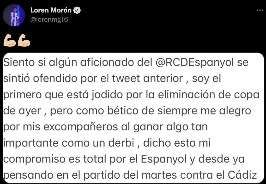 "Siento si algún aficionado del Espanyol se sintió ofendido por el tuit anterior. Soy el primero que está jodido por la eliminatoria de Copa de ayer (en referencia a la eliminación en octavos a manos del Mallorca), pero, como bético de siempre, me alegro por mis excompañeros al ganar algo tan importante como un derbi. Dicho esto, mi compromiso es total con el Espanyol; y desde ya pensando en el partido del martes contra el Cádiz", escribió Loren, que recibió el apoyo y la comprensión de un sinfín de seguidores verdiblancos, que se enfrentaron a varios 'pericos'.