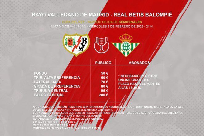 Como la zona reservada en el estadio de Vallecas para aficionados del equipo visitante se encuentra en obras, no ha habido tal concesión y los aficionados verdiblancos que quieran acudir al primer duelo de las semifinales coperas tuvieron que comprar las entradas en la taquilla de Vallecas (como muchos mostraron por redes sociales), con precios entre los 50 y los 200 euros, y deberán mezclarse este miércoles con la afición local. Algo, a priori, poco compatible con un partido declarado de alto riesgo.