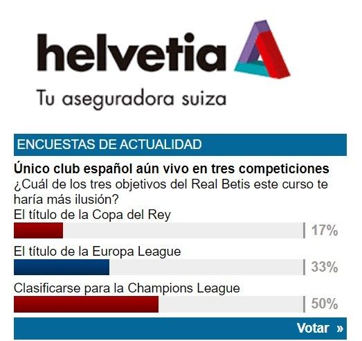 Los lectores de ESTADIO Deportivo parecen estar de acuerdo con los profesionales y, parafraseando a Melendi en uno de sus hits más famosos, pueden estar "hablando en plata", pero seguro que lo hacen mientras andan "soñando en oro". Por eso, la mitad de los participantes en la encuesta planteada por este medio de comunicación al respecto de cuál de los tres objetivos que persigue el Betis en la temporada 2021/2022 haría más ilusión a sus aficionados señala la clasificación para la Champions League, una vía que inauguró para las andaluces el conjunto heliopolitano allá en 2005, siguiéndole después Sevilla FC y Málaga CF. Por tanto, el 50% preferiría retener la tercera plaza o, como mucho, bajar hasta la cuarta, muy por delante de quienes sacrificarían los otros dos por la conquista de la Europa League (33%), que daría derecho a disputar la siguiente UCL, por un 17% que se quedaría con la Copa del Rey.